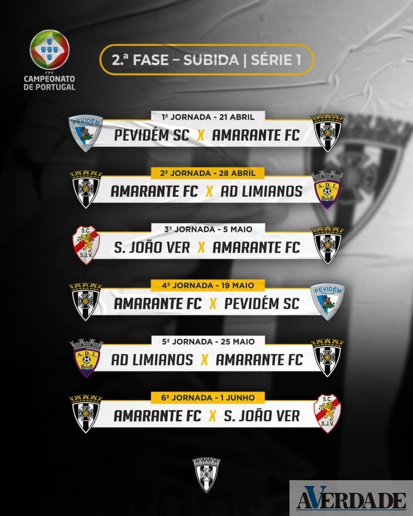 O Amarante FC já conhece o calendário para a segunda fase do Campeonato de Portugal. A equipa orientada por Renato Coimbra, que disputa a prova pela segunda temporada consecutiva, vai lutar com Pevidém, Limianos e São João Ver pelo acesso à Liga 3.
