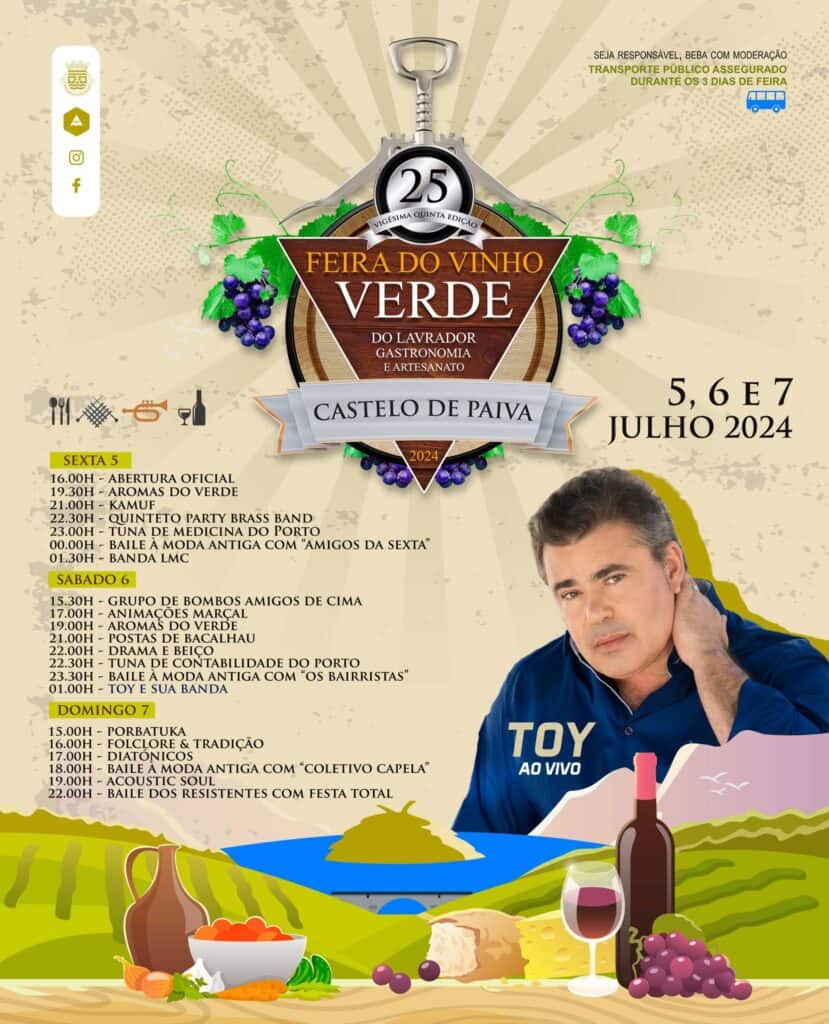 Este fim de semana, nos dias 5, 6 e 7 de julho, realiza-se a 25.ª edição da Feira do Vinho Verde, do Lavrador, Gastronomia e Artesanato, no Largo do Conde, em Castelo de Paiva.